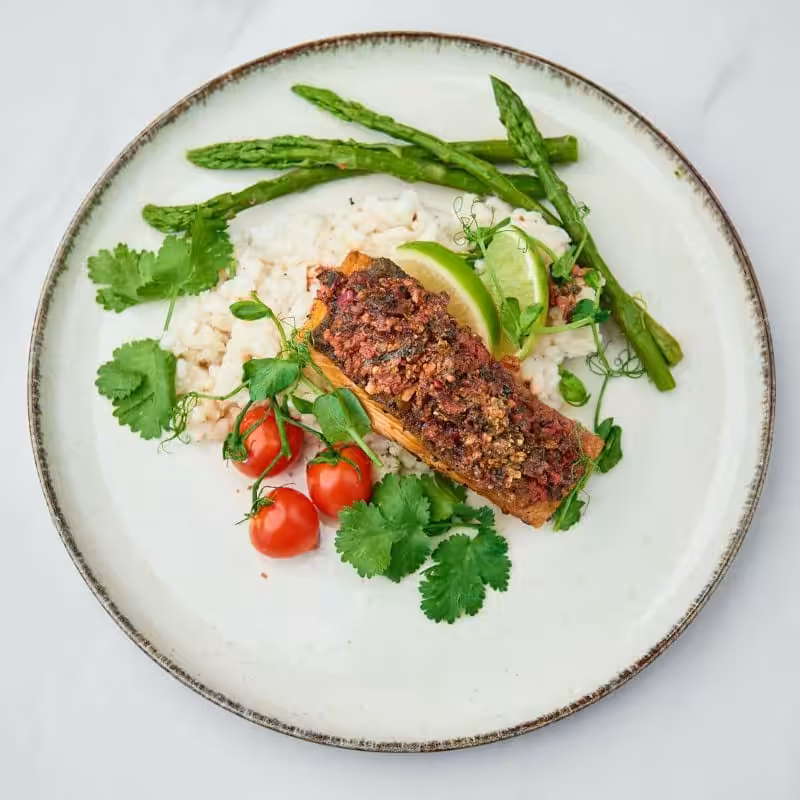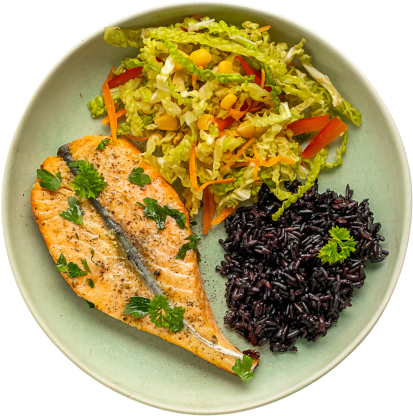 Łosoś w sosie z zielonego pieprzu z czarnym ryżem i surówką z kapusty pekińskiej