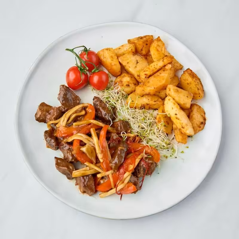 Gulasz wołowy z papryką, plackami ziemniaczanymi i kwaśną śmietaną