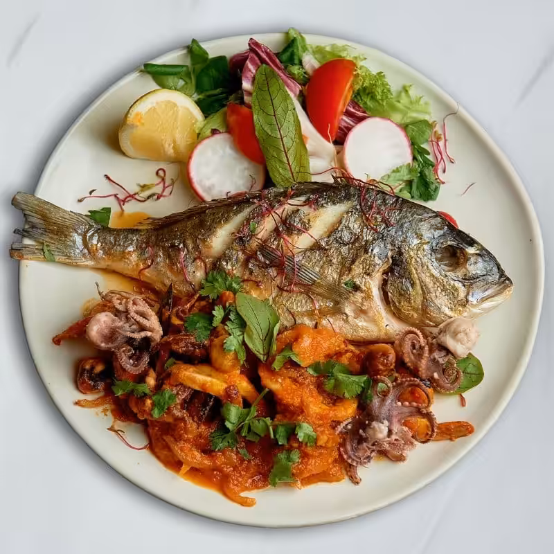 Grillowany sandacz z sosem vierge, pieczonymi pomidorkami cherry i czerwonym ryżem