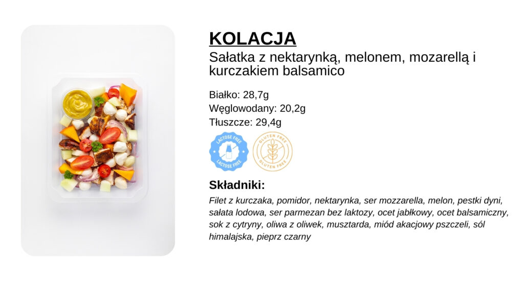 Sałatka z nektarynką, melonem, mozarellą i kurczakiem balsamico