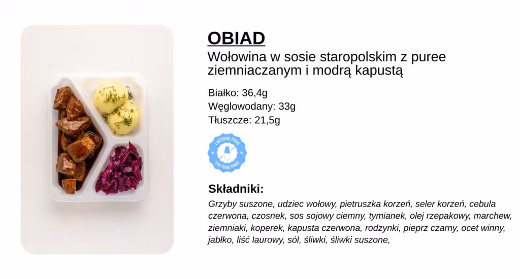 Wołowina w sosie staropolskim z puree ziemniaczanym i modrą kapustą