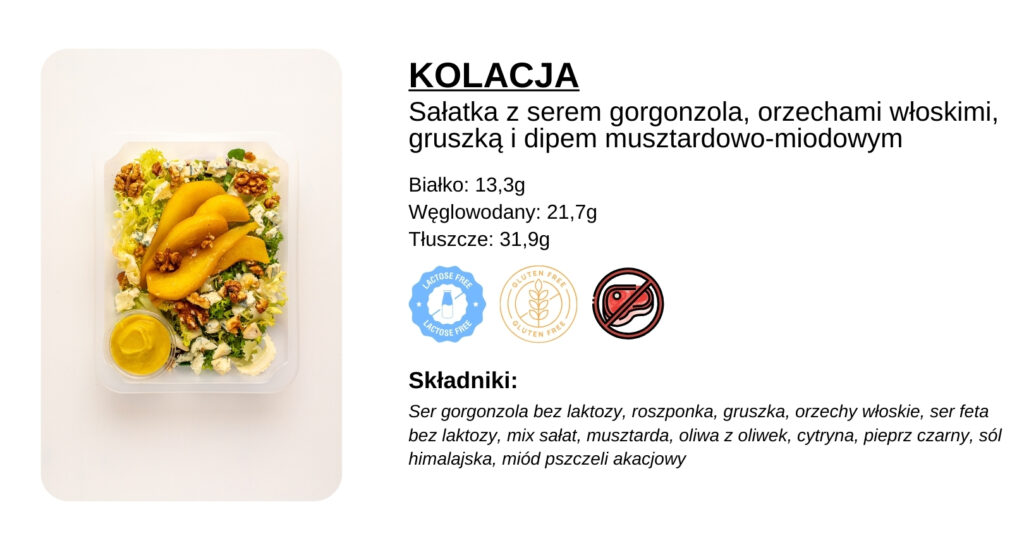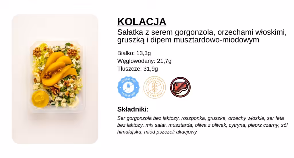 Sałatka z serem gorgonzola, orzechami włoskimi, gruszką i dipem musztardowo-miodowym